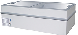 Chest freezer display case by Iarp, suitable for the display of all types of frozen food products. Features low E sliding glass lids, manual defrost, large storage capacity, castor wheels and internal baskets.